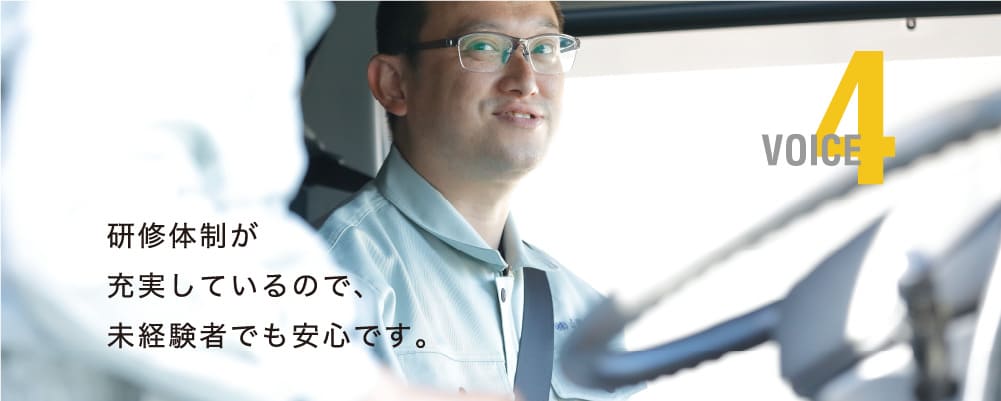 運転の仕方、業務の内容や流れ、ルールなどについて、丁寧に指導してもらえるため、未経験者も安心です。